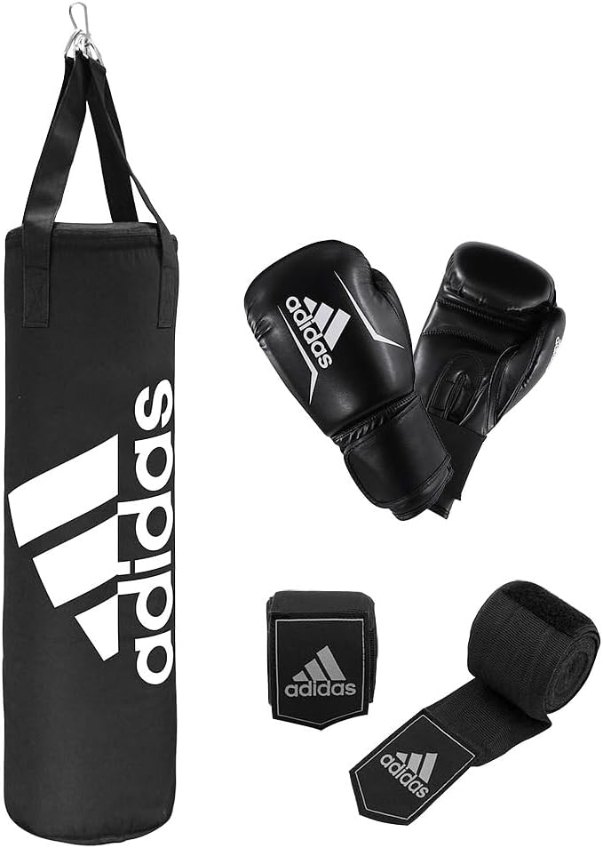 Das Adidas Performance Boxing Kit ist ideal für Anfänger. Es besteht aus einem haltbaren Nylonmaterial und ist mit Textilien gefüllt. Das Boxset enthält auch Boxhandschuhe in 10 Unzen aus haltbarem Kunstleder. 2,55 m lange Wraps vervollständigen das Paket für ein gutes Heimtraining.
