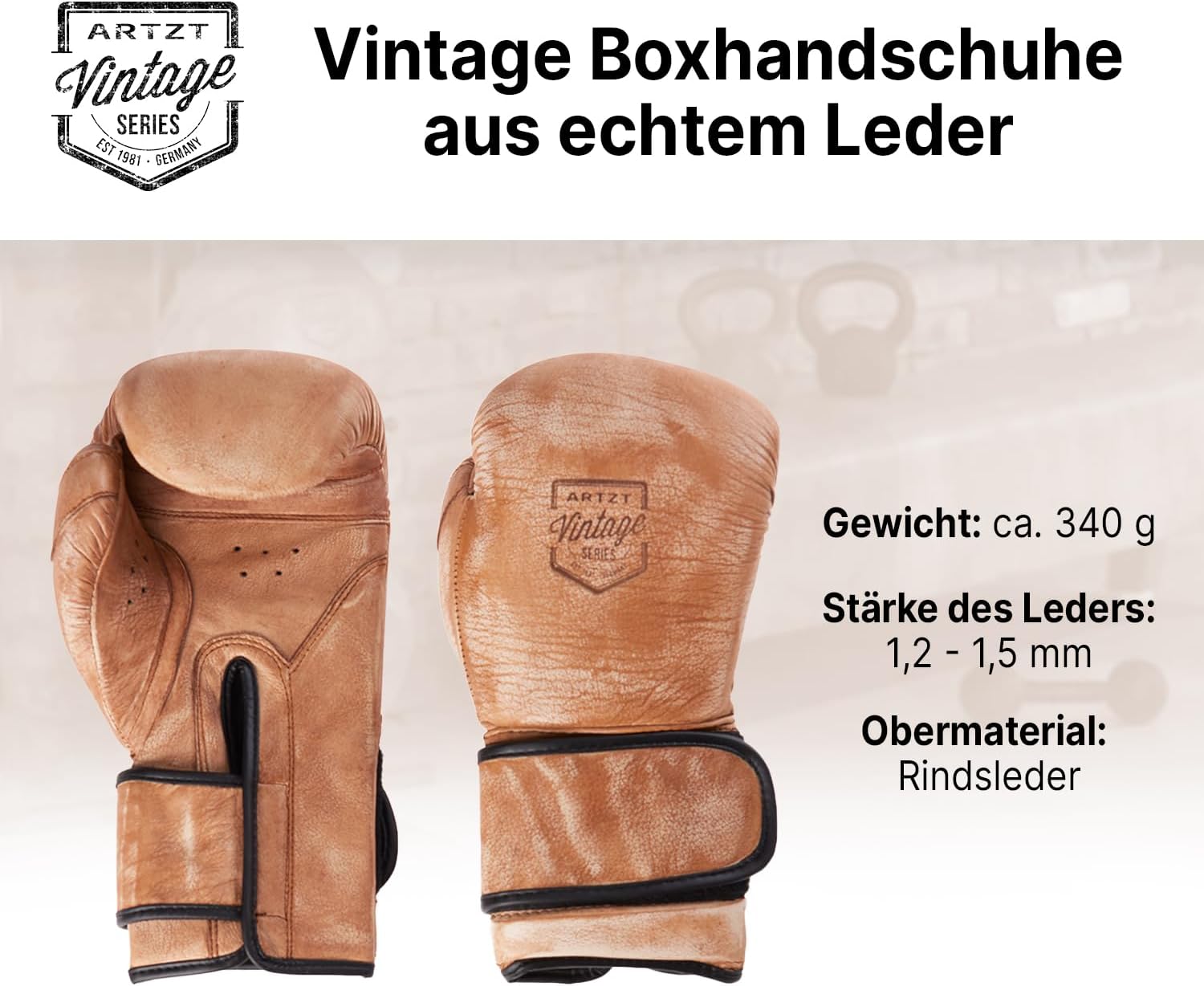 Die ArtZT Vintage -Serie -Boxhandschuhe der ArtZT Vintage -Serie sind im selben authentischen Vintage -Look erhältlich. Mit einem Gewicht von 12 Unzen sind Sie ideal zum Sparring und zum Training auf Stochbeutel und Göre. Die Handschuhe sind ideal für Männer, Frauen und Teenager. Der lange Schaft bietet Schutz am Handgelenk, den genähten Daumen für zusätzliche Sicherheit während des Trainings. Die absolut qualitativ hochwertige und robuste Verarbeitung verwendet Kuhpferd -Leder mit einer Dicke von 1 mm – nichts bricht so schnell.