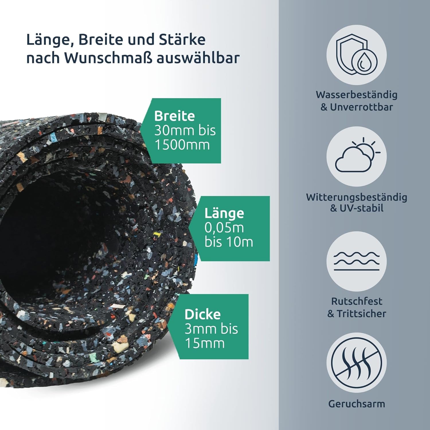 Materialstärken 3mm bis 15mm Materialbreiten 30mm bis 1500mm (0,03m bis 1,5m) Materiallängen 50mm bis 10000mm (0,05m bis 10m) Temperaturbereich -30°C bis +120°C Materialeigenschaften wasserdurchlässig, selbstliegend (schwer), schwer entzündlich, verrottungsfest, stark belastbar (ca. 10% Stauchung bei 19t/m²), UV-beständig Einsatzbereich Außen- und Innenbereich Funktionen Entkopplung, Vibrationsschutz, Schallschutz, Dämpfung, Dämmung, Antirutschmatte, Oberflächenschutz, Trennschicht, etc. Einsatzbereich PRIVAT (Fitnessgeräte, Lautsprecher, Haushaltsgeräte, Fallschutzmatte, etc.) // LOGISTIK / INDUSTRIE (Ladeflächen, Transportfahrzeug, Transportschutz, Palettenauflage, etc.)