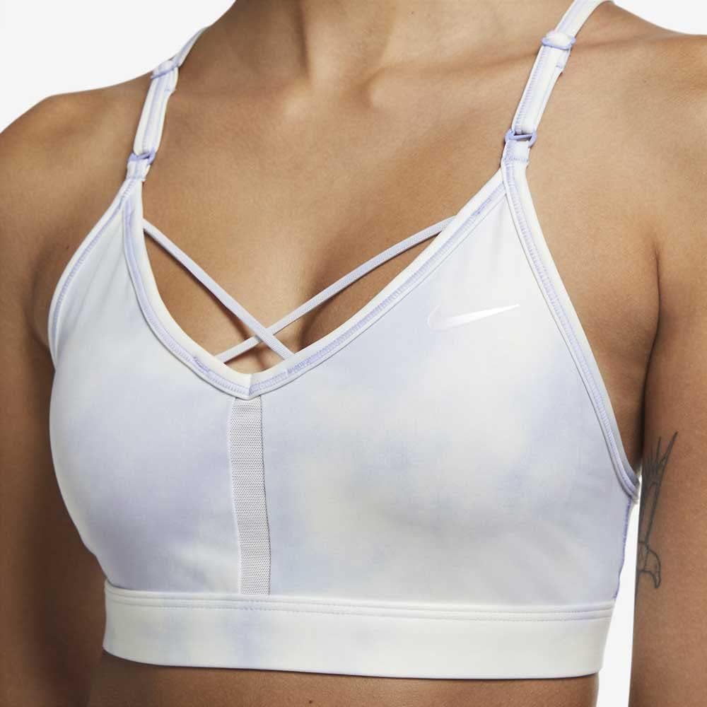 Ursprünglich entworfener Sport-BH von Nike mit einem raffinierten Racerback-Design in Criss-Cross-Gurten. Doppelte Frontgurte, U-förmiger Ausschnitt. Abnehmbare Pads elastischer, schnell trocknender Qualität dank der Dri-Fit-Technologie.