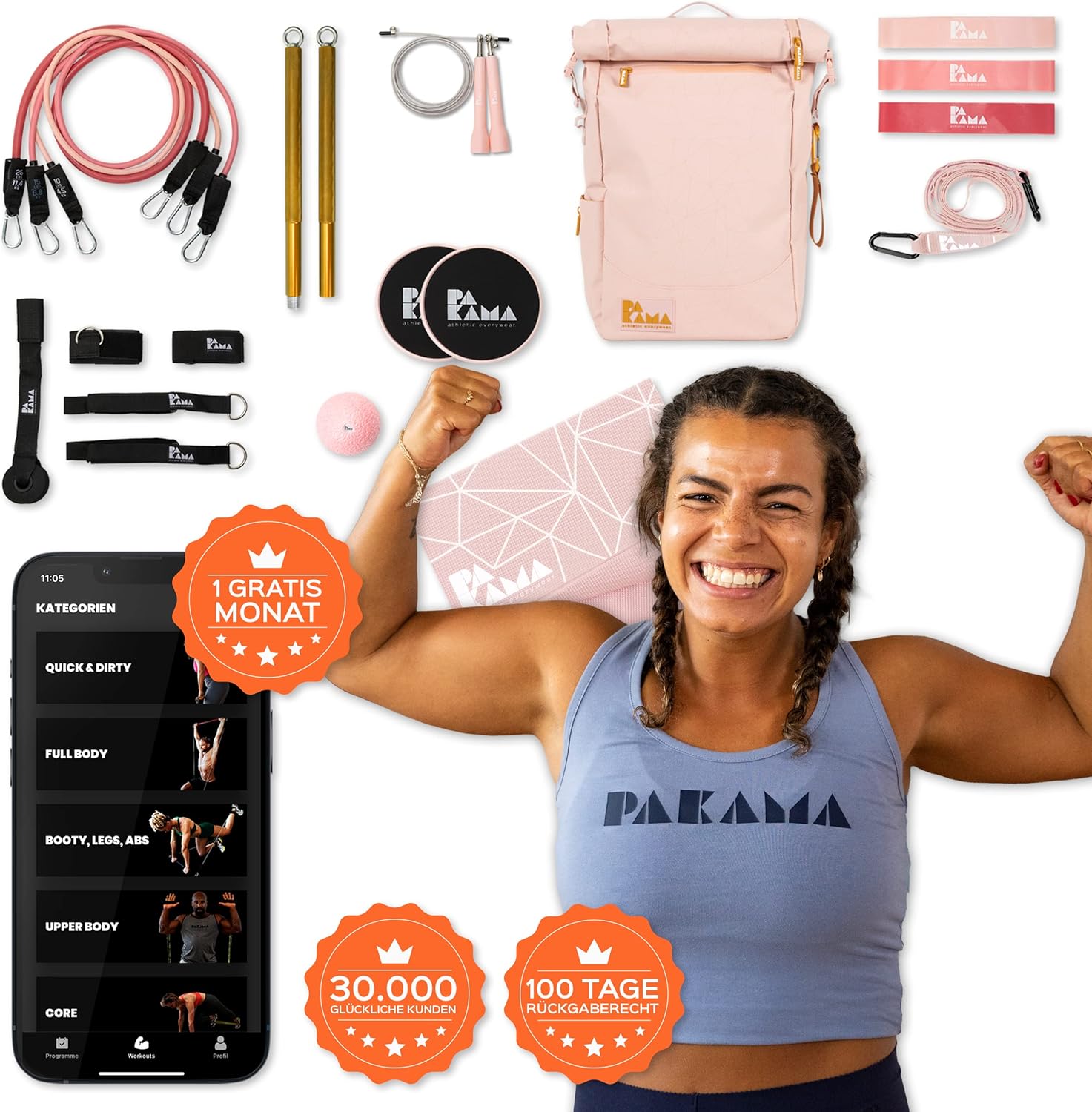 Dies sind die Werkzeuge: 3 Pakama -Widerstandsbänder, 3 Pakama -Mini -Bands, 2 Pakama -Fußgurte, 2 Pakama -Griffe, 2 Pakama -Folien, 1 Pakama Bar, 1 Pakama Speed Seil, 1 Pakama Sling Trainer, 1 Pakama -Türanker, 1 Pakama Fascia Ball, 1 Pakama Mat (Foldable)