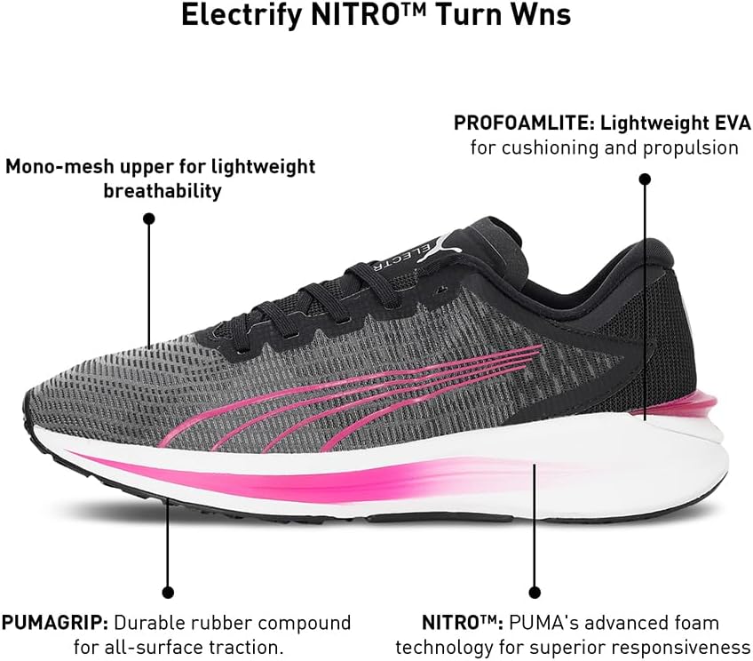 Legen Sie die langweiligen Laufsitzungen mit unserer Electrify -Sammlung von Performance -Laufschuhen ein. Unsere Electrify Nitro -Turn -Laufschuhe sind mit der neuesten Sporttechnologie mit einem Dual Nitro -Schaum und Profoam -Zwischensohle für leichte, hohe Rebound -Leistung und eine Pumagrip -Außensohle für ultimative Traktion auf jeder Oberfläche ausgestattet. Nitro -Schaum: Fortgeschrittene Technologie von Puma für herausragende Reaktionsfähigkeit und Polsterung bei niedrigem Gewicht. Profoam: Pumas leichter EVA-Mittelsohle mit hohem Rundfund bietet eine sofortige Polsterung und Reaktionsfähigkeit. PUMAGRIP: Langlebige Puma -Gummiverbindung zum Griff auf jeder Oberfläche. Niedriger Schaft mit zweifarbigem Leichtgewicht mit reflektierenden Designelementen. Zweiteiler Nitro-Schaum und Profoam Lite-Zwischensohle. PUMAGRIP -Außensohle. TPU -Fersenspoiler.