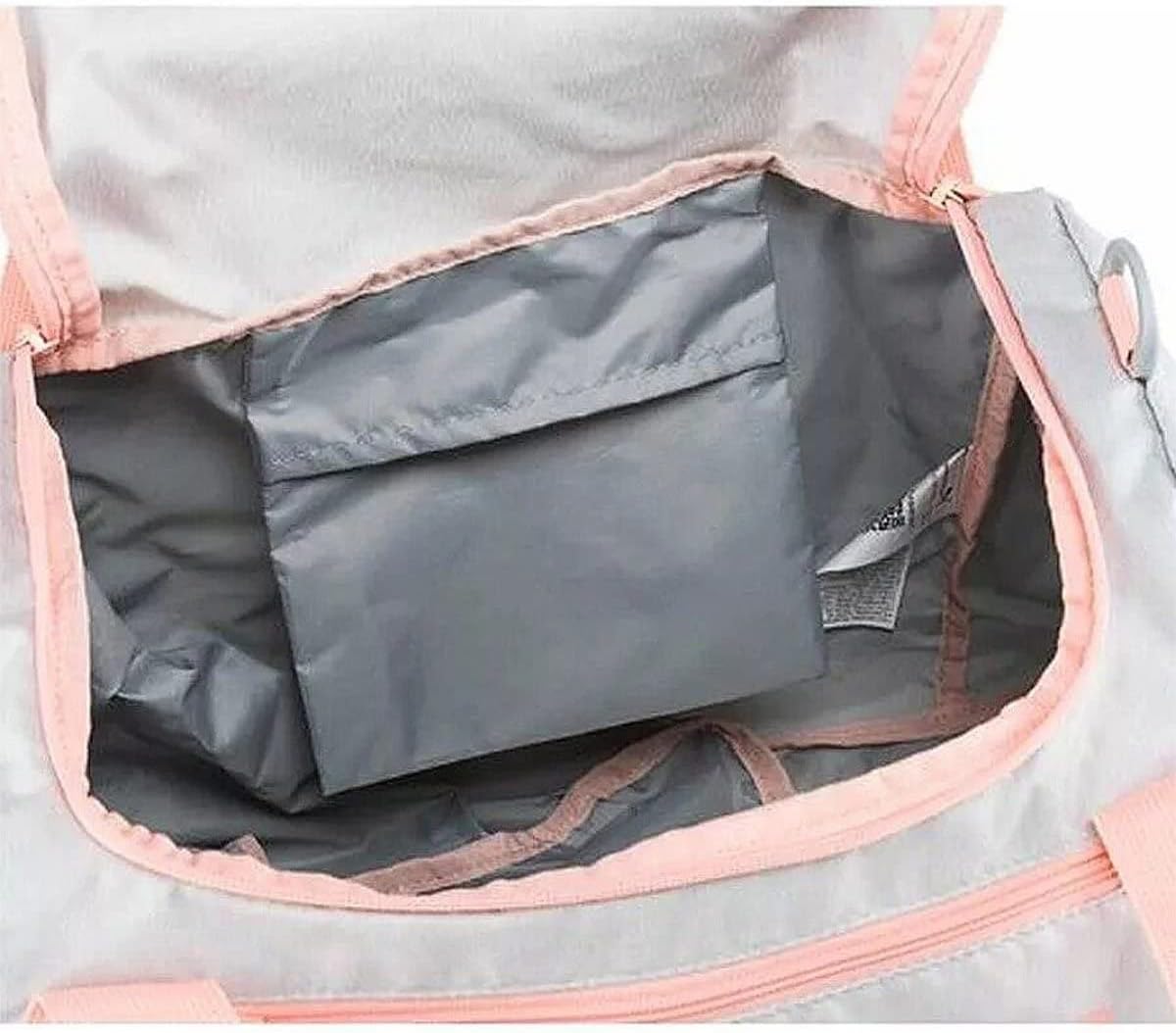 Eine Maschen -Seitentasche, ein Schuhfach auf der anderen Seite und eine Reißverschlusspocke auf der Vorderseite.