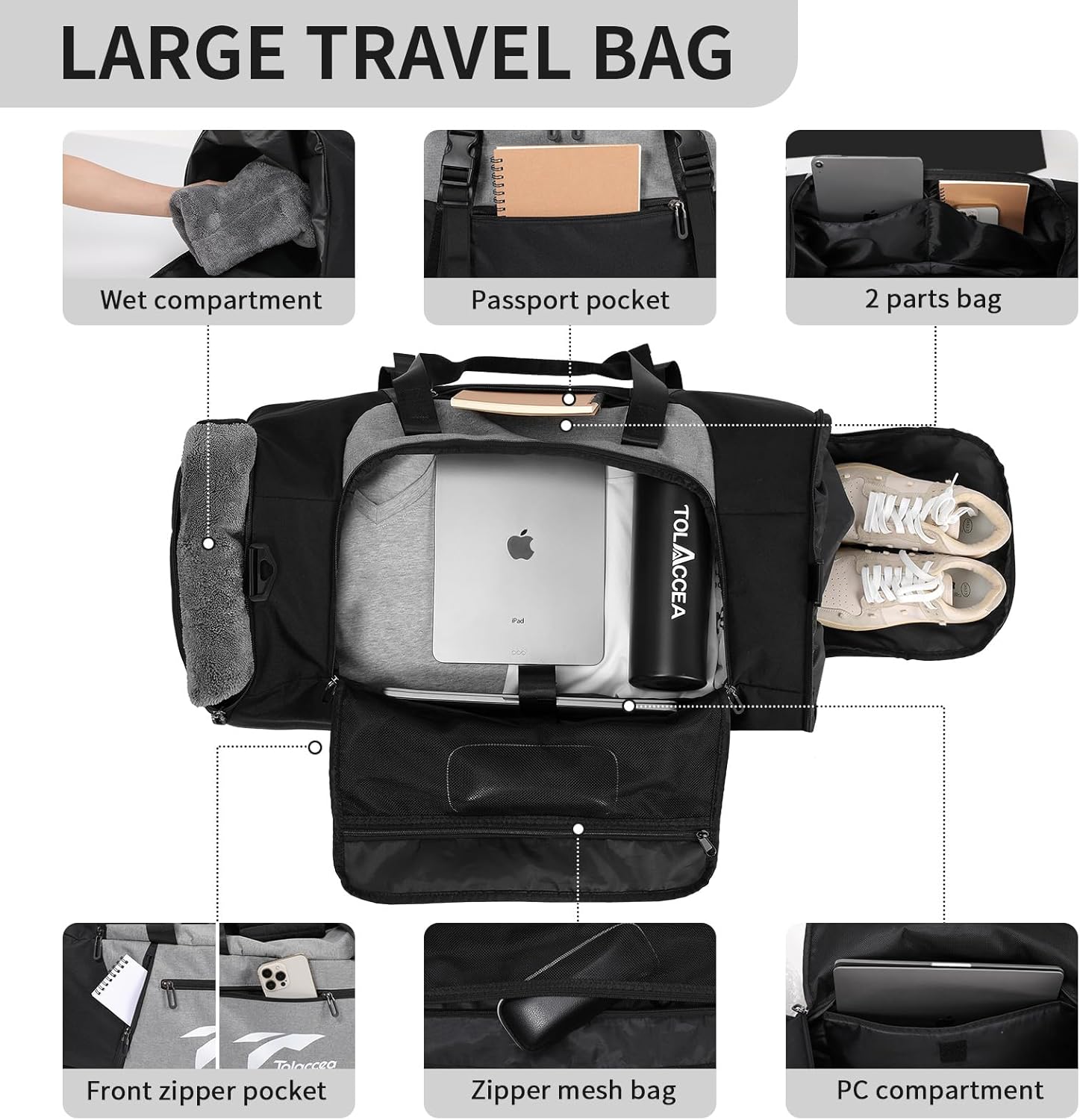 Mehrzweck-Handgepäck: Die Tolaccaa-Tasche ist eine unisex klassische und nachdenkliche Mehrzweckbeutel. Ob Trainingstasche, Reisetasche, Schwimmbeutel, Saunabeutel, Schwimmbeutel oder als Woche. Das erweiterbare Design erfüllt optimal die Bedürfnisse verschiedener Menschen und eignet sich daher sowohl für Männer als auch für Frauen