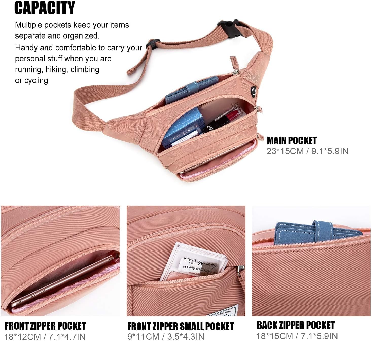 Einstellbarer Gürtel: Der Taillengurt bietet 54 cm einstellbare, minimale Länge: 70 cm. Maximale Länge: 124 cm. Groß genug für ein 5,5 -Zoll -Bildschirm -Mobiltelefon wie das iPhone 8