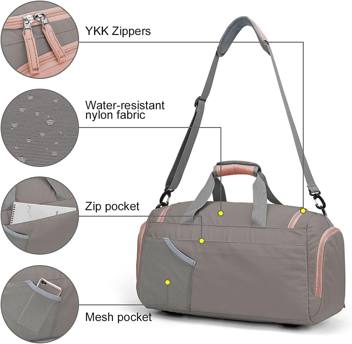 Schöne Frauen -Sporttaschen: Frauen -Sporttasche für Reisen und den täglichen Gebrauch. Es besteht aus robustem Nylongewebe, das nicht nur extrem stark, sondern auch staubsicheres und wasserabweisendes ist. Über Verpackung: Die Reisetasche ist in zwei Hälften gefaltet, so dass die Trainingsbeutel unweigerlich Falten hat. Wir empfehlen Ihnen, die Sporttasche nach dem Waschen der Schwimmbeutel der Frauen voll zu halten. Nach ca. 3 Wochen verschwinden die Falten langsam