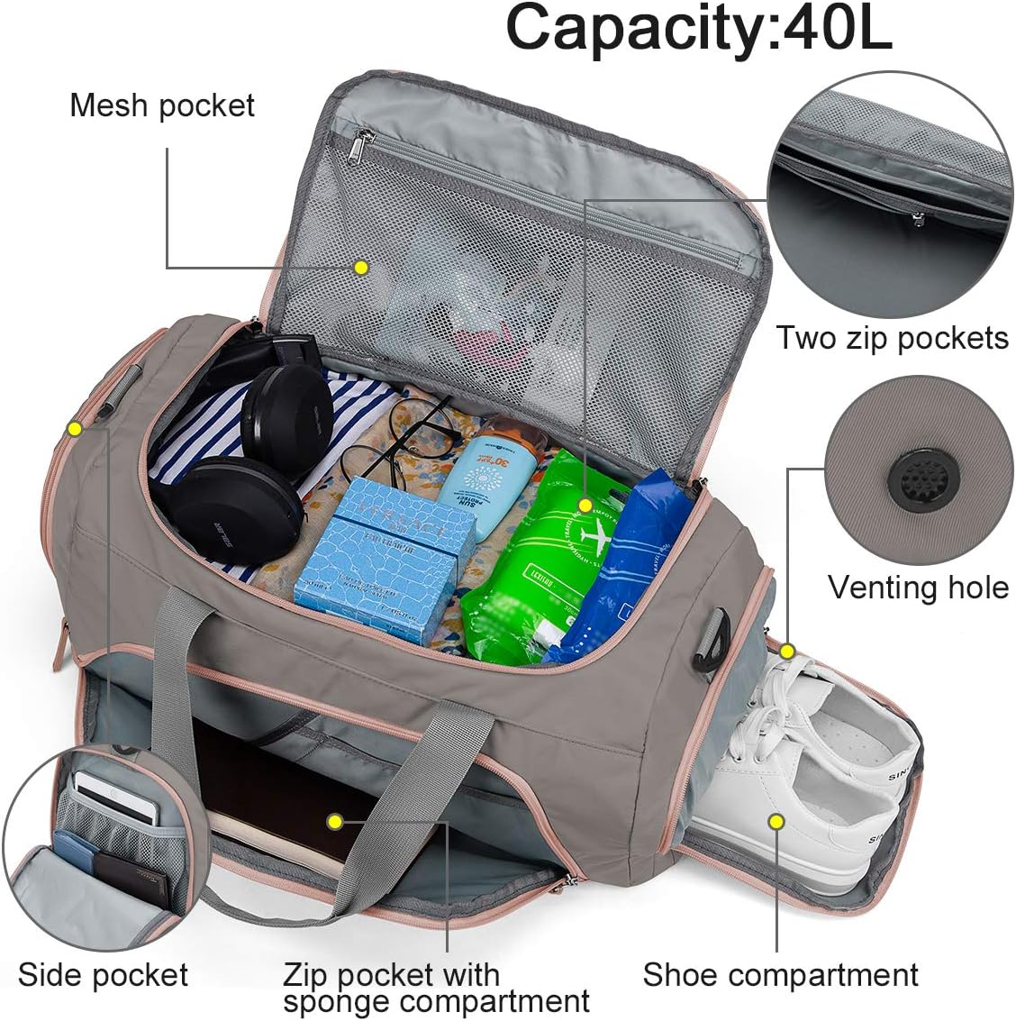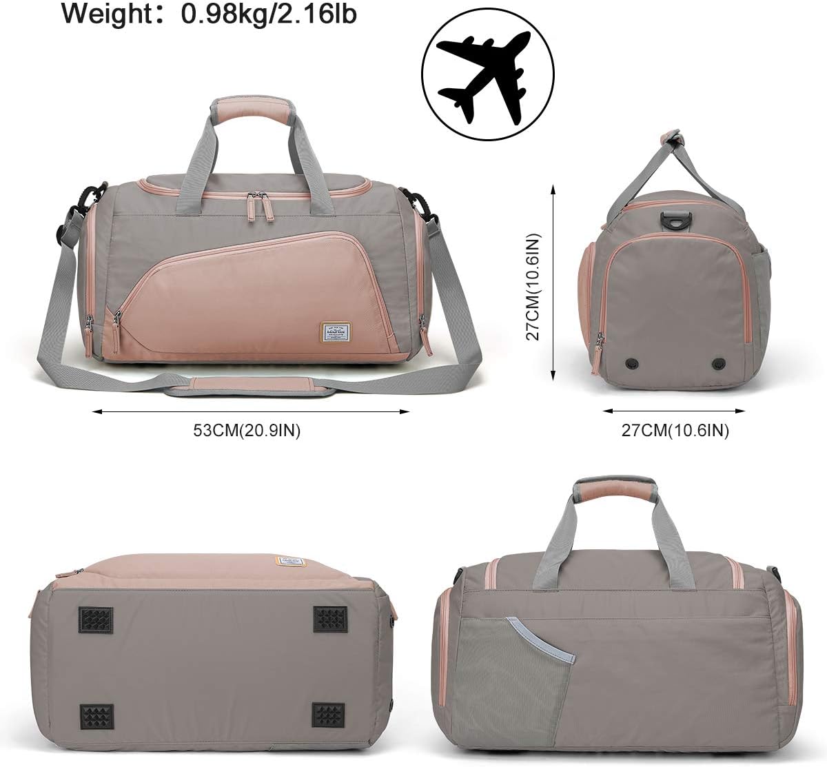 35 l Handgepäck: Die Frauensportasche für Frauen verfügt über ein geräumiges Hauptfach mit einer Kapazität von 35 l, Größe 53 x 27 x 27 cm, Gewicht: 0,98 kg, Flughafenfreundlichkeit. Die Frauen -Sporttasche mit großer Kapazität bietet Platz für alle wichtigen Dinge wie Fitnesskleidung, Duschtuch, Schuhe, Waschen von Kit