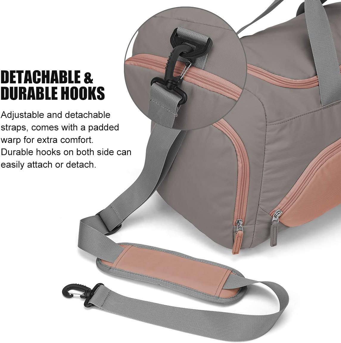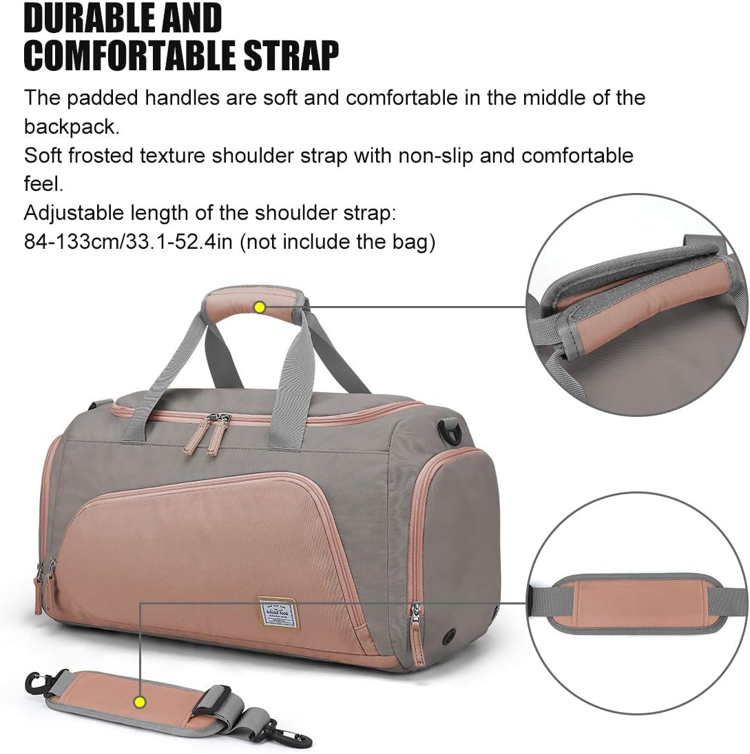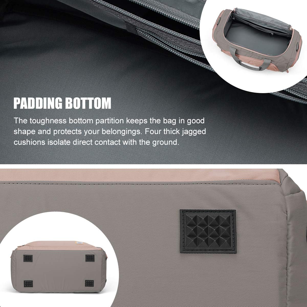 Verstärkte Basis: Die gummierte Polsterung schützt den Inhalt vor Feuchtigkeit und Schmutz, wenn Sie die Weekender -Trainingsbeutel auf den Boden legen müssen. Die gepolsterte untere verstärkte Basis hält die Fitnessbeutel für Frauen in gutem Zustand und schützt Ihre Sachen